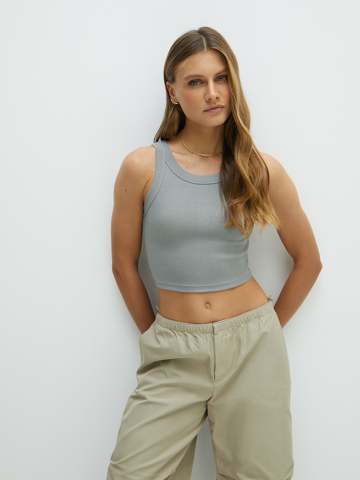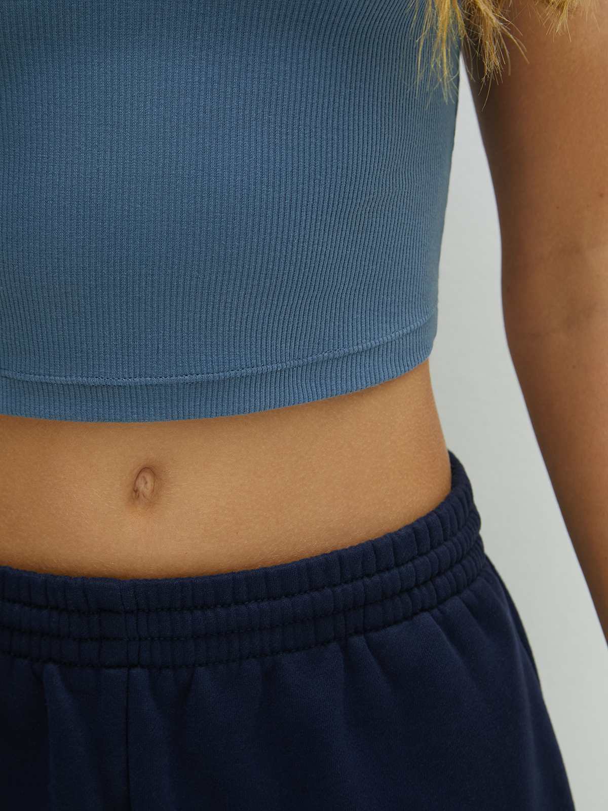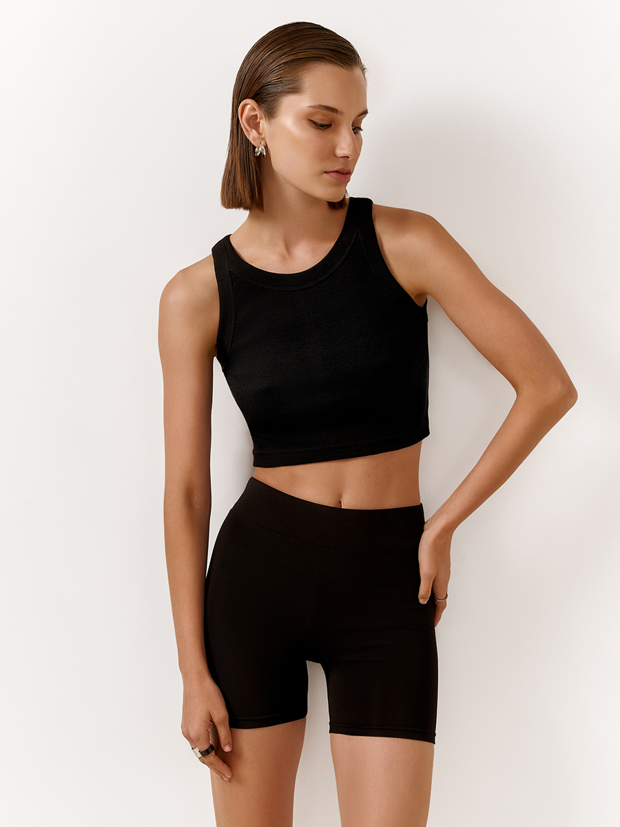 Топ эффектно смотрится благодаря вязке «английская резинка» и отлично пойдет для создания стильных образов.