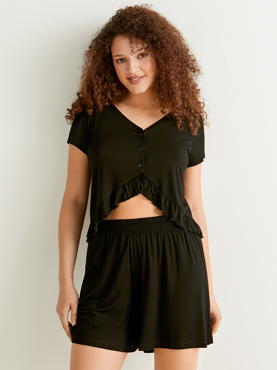 Женский домашний комплект: укороченная кофта с V-образным вырезом и фигурным низом и расклешенные шорты без карманов с резинкой на поясе.